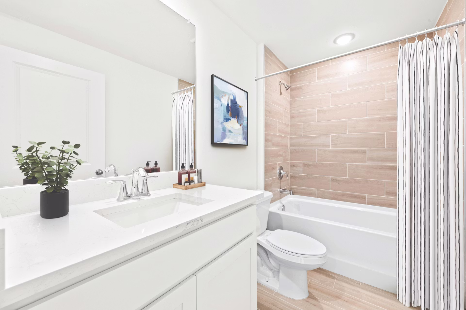 The Palm offers 1,550 square feet of thoughtfully designed living space. The spacious Great Room with its vaulted ceiling flows effortlessly to the private covered lanai—ideal for indoor-outdoor living and entertaining. At the heart of this open layout, the kitchen features a freestanding island, walk-in pantry, and designer cabinetry, opening to a bright dining area with a tray ceiling and abundant natural light. The primary suite includes a generous walk-in closet and a private bath with dual vanities, a tiled shower, and convenient linen storage. Additional highlights include upgraded plank tile throughout the main living areas, designer cabinetry & quartz counters in the kitchen and baths, hurricane-impact windows and doors, stainless steel kitchen appliances, and an attached two-car garage.