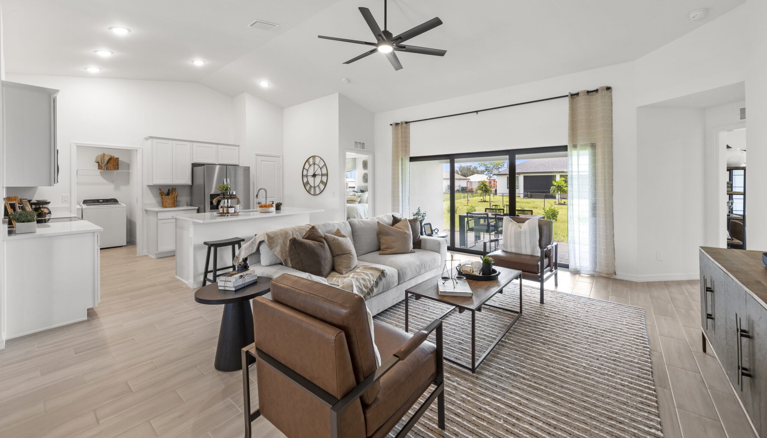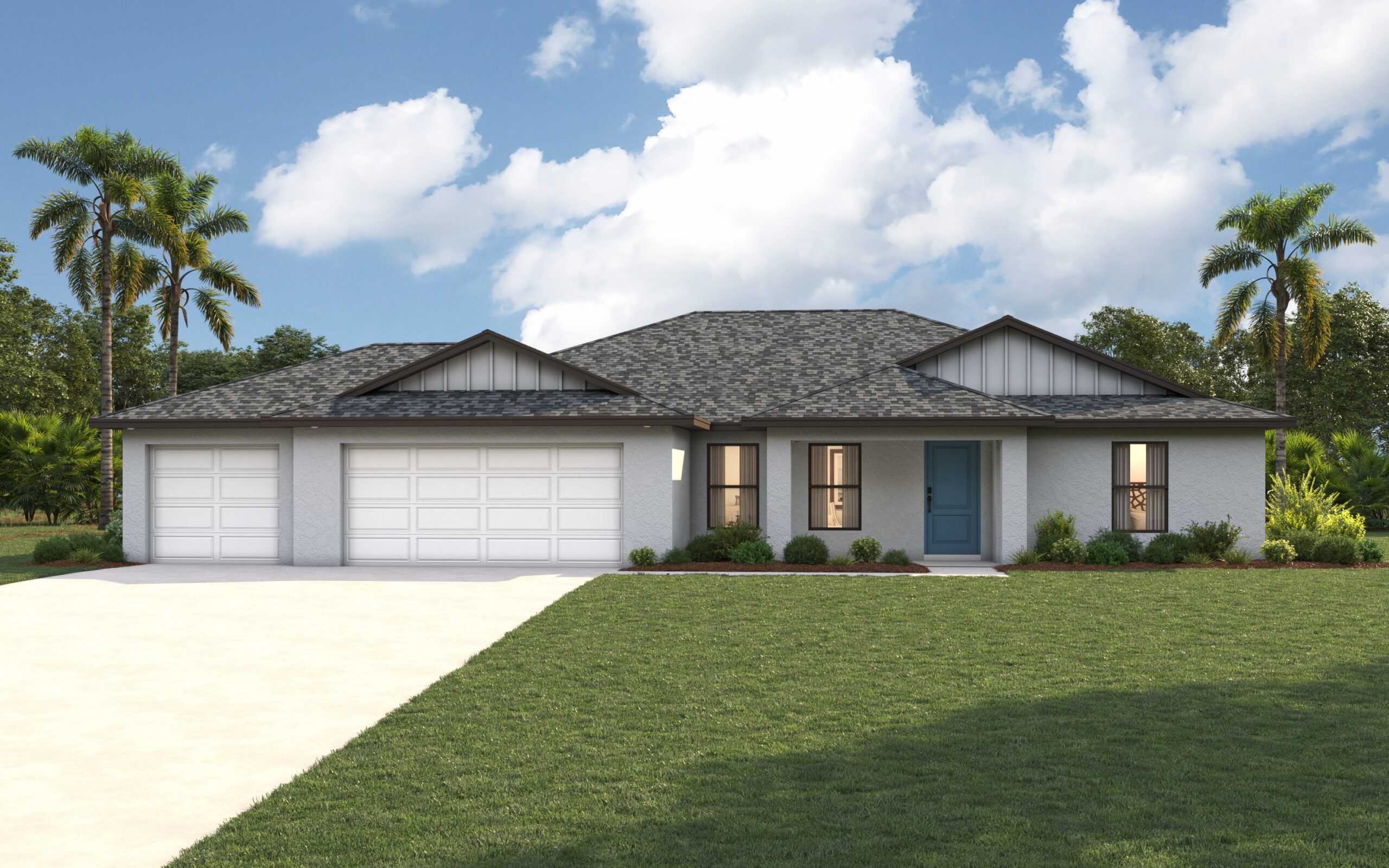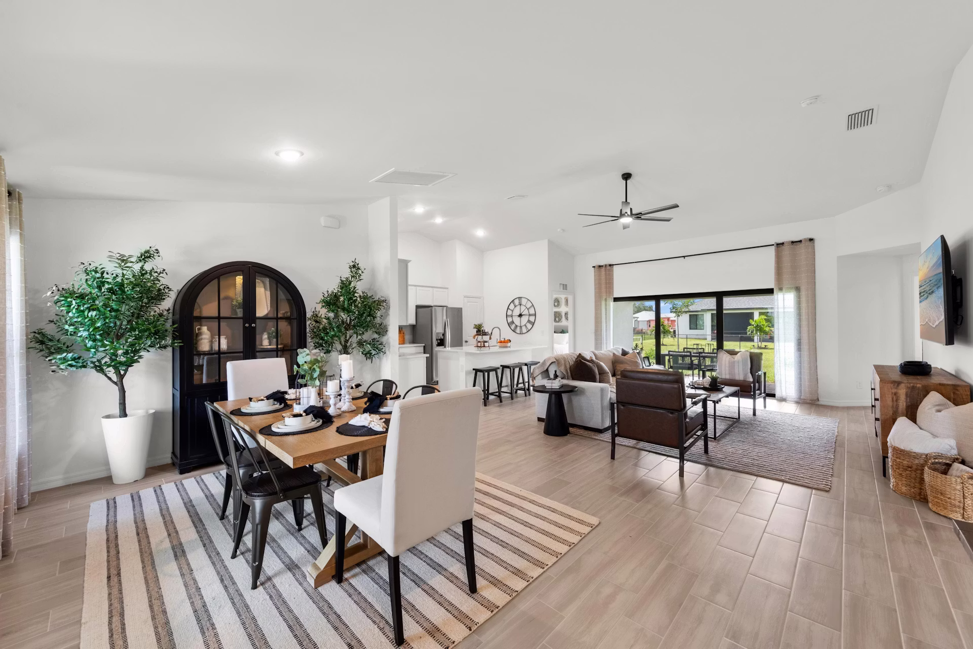 The St. Augustine blends elegant design with everyday functionality, offering the perfect balance of indoor comfort and outdoor living. A welcoming covered front porch leads into the heart of the home, where an open-concept layout with a vaulted ceiling creates a sense of spaciousness and flow. The dining area with double windows, gourmet kitchen with a freestanding island and pantry, and expansive Great Room with sliding glass doors all work together to maximize natural light and create an inviting atmosphere. Step outside to the large covered lanai—ideal for relaxing or entertaining.  The private Primary Suite is a true retreat, featuring two generous walk-in closets and an en-suite bathroom with a dual sink vanity, a tiled walk-in shower, and a large linen closet for added convenience. On the opposite side of the home, three additional bedrooms provide flexibility for family, guests, or the perfect home office.
