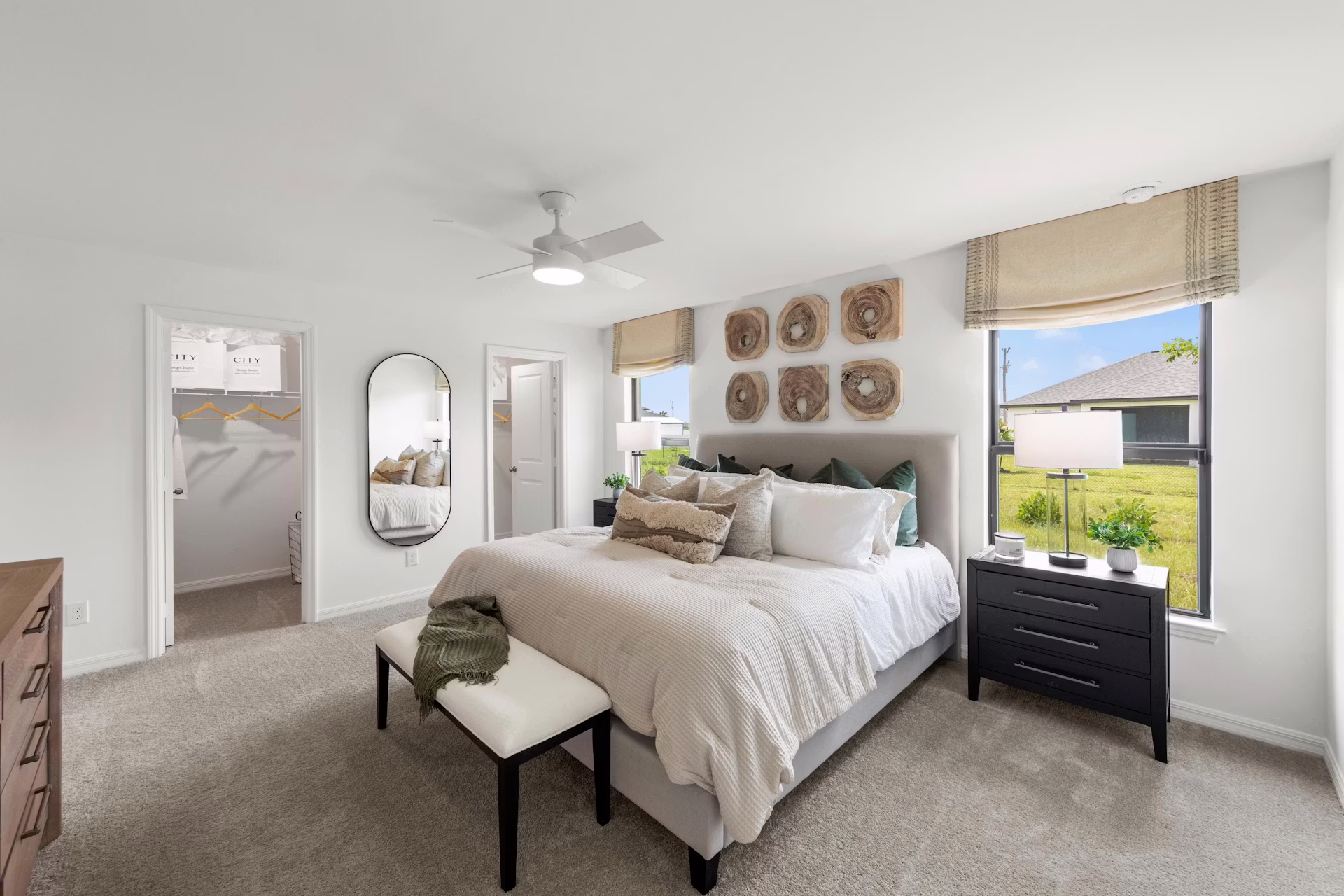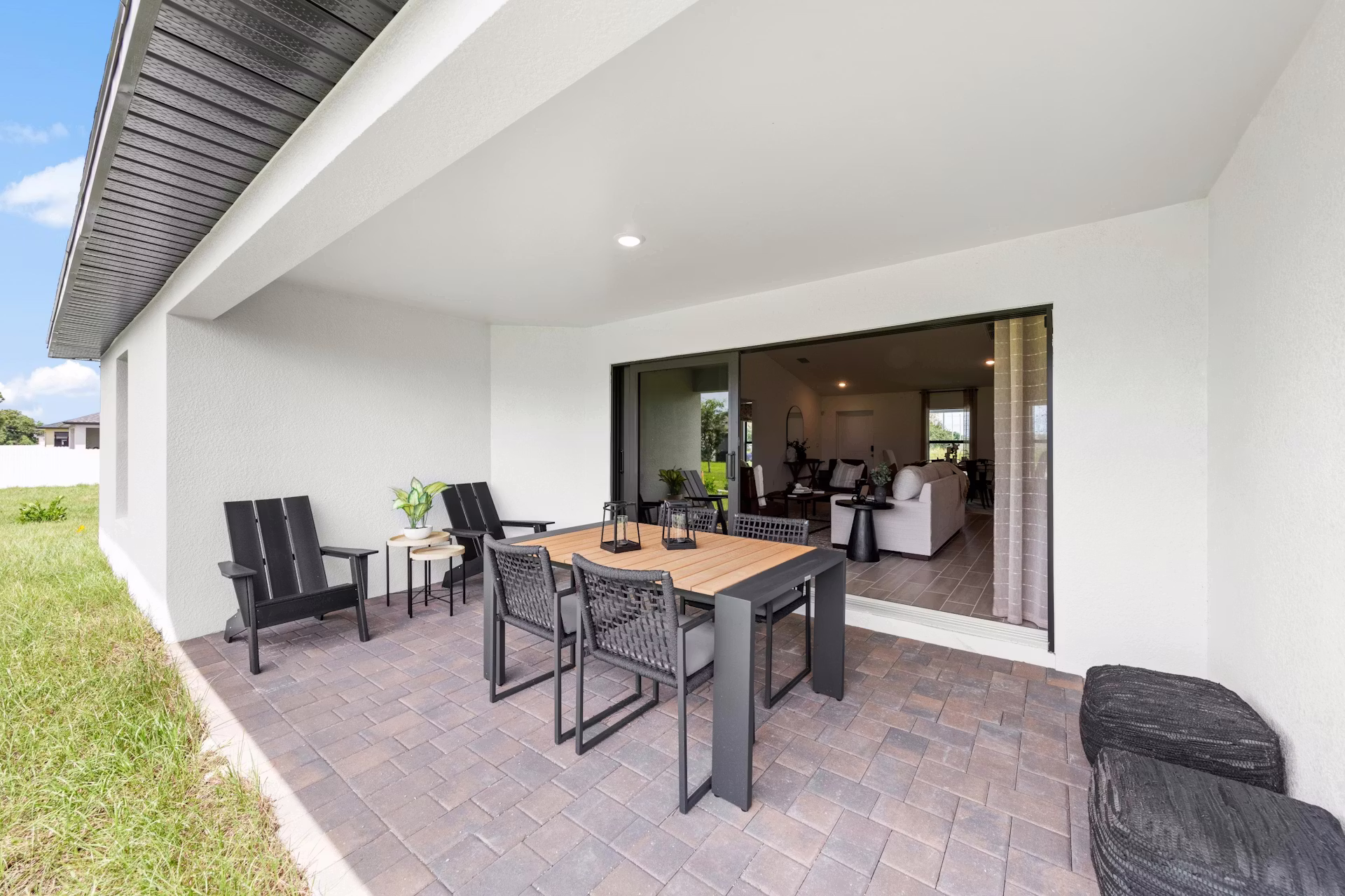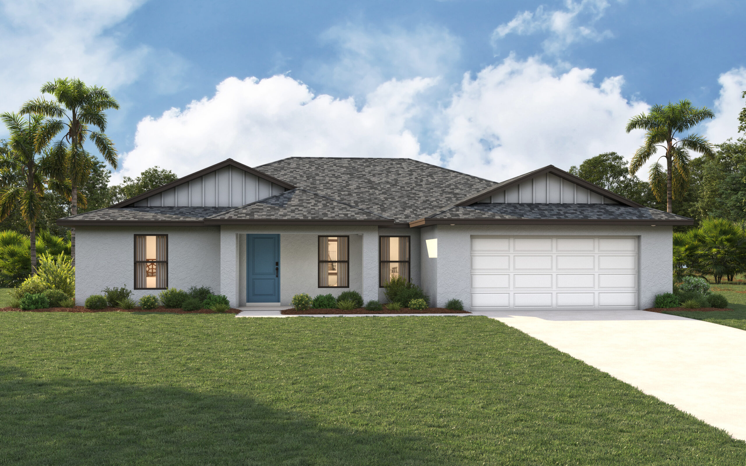 The St. Augustine blends elegant design with everyday functionality, offering the perfect balance of indoor comfort and outdoor living. A welcoming covered front porch leads into the heart of the home, where an open-concept layout with a vaulted ceiling creates a sense of spaciousness and flow. The dining area with double windows, gourmet kitchen with a freestanding island and pantry, and expansive Great Room with sliding glass doors all work together to maximize natural light and create an inviting atmosphere. Step outside to the large covered lanai—ideal for relaxing or entertaining.  The private Primary Suite is a true retreat, featuring two generous walk-in closets and an en-suite bathroom with a dual sink vanity, a tiled walk-in shower, and a large linen closet for added convenience. On the opposite side of the home, three additional bedrooms provide flexibility for family, guests, or the perfect home office.