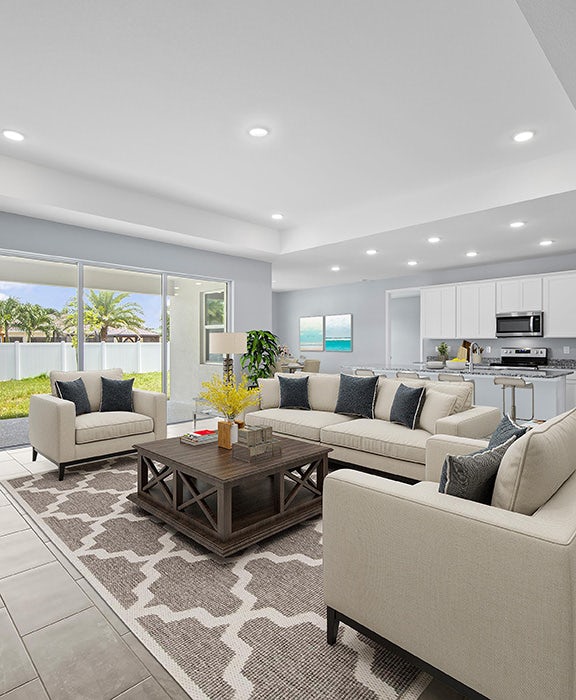 The Grand Cayman offers the perfect blend of style, functionality, and comfort, with 1,974 square feet of thoughtfully designed living space. At the heart of the home lies an open-concept layout ideal for entertaining, featuring a gourmet kitchen with a spacious island, a dedicated dining area, and an expansive Great Room with elegant tray ceiling. Triple sliding glass doors open to the large covered lanai, seamlessly blending indoor and outdoor living. The luxurious primary suite is tucked away for privacy and showcases a tray ceiling, two large walk-in closets, and a spa-inspired en-suite bathroom complete with a dual-sink vanity, a beautifully tiled walk-in shower, and a private water closet. On the opposite side of the home, a private hallway leads to two generously sized guest bedrooms and a well-appointed full bath, offering both comfort and convenience for family or visitors. A versatile den located just off the foyer provides the perfect space for a home office, study, or creative retreat. Additional highlights include: 8-foot interior doors throughout; Quartz countertops in kitchen and bathrooms; designer cabinetry with soft-close doors, stainless steel kitchen appliance package, upgraded plank tile in all main living areas, hurricane-impact windows and doors, 2-car garage with direct access to laundry room, and covered front entry. Optional 3-car garage upgrade available on select homesites.