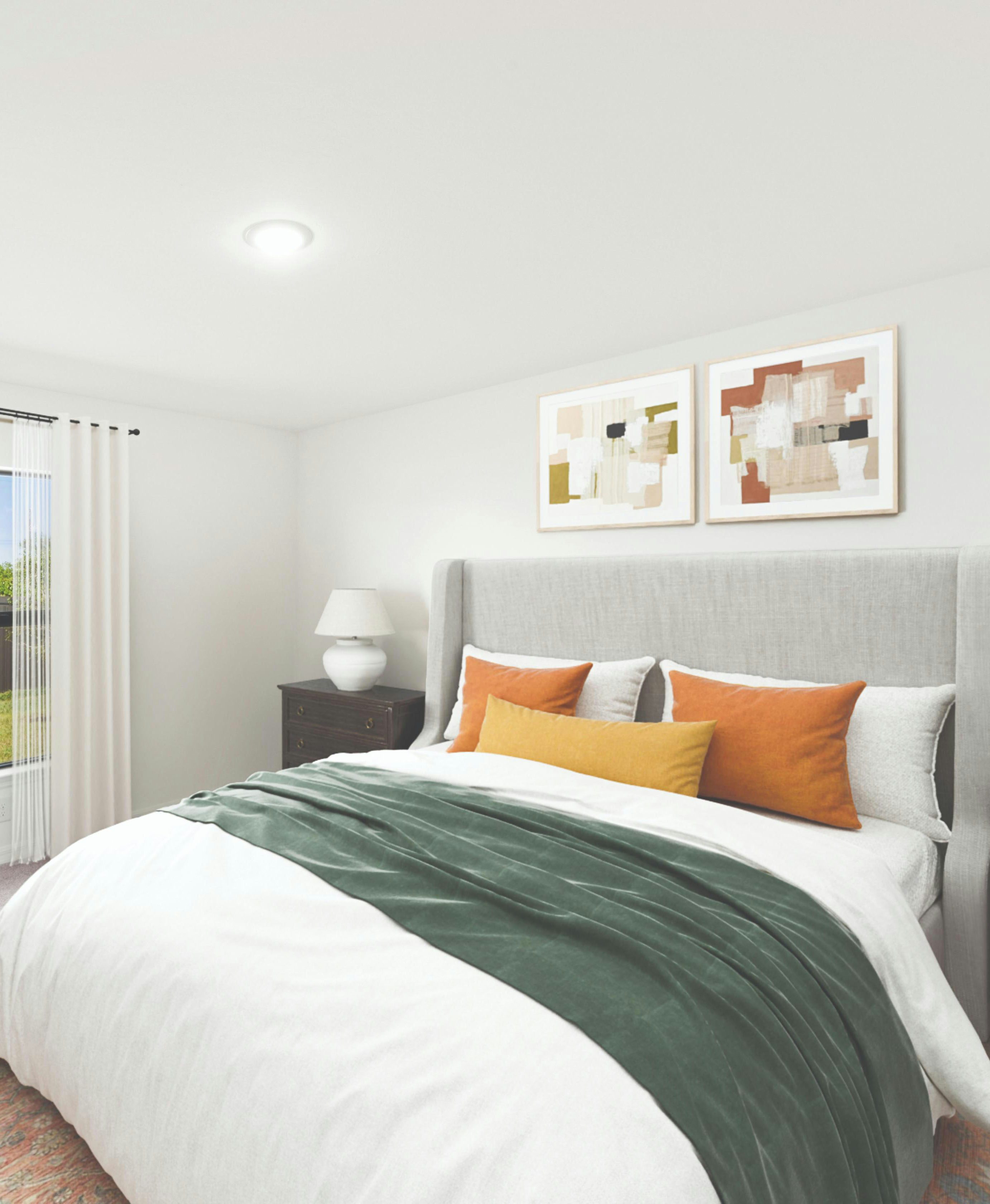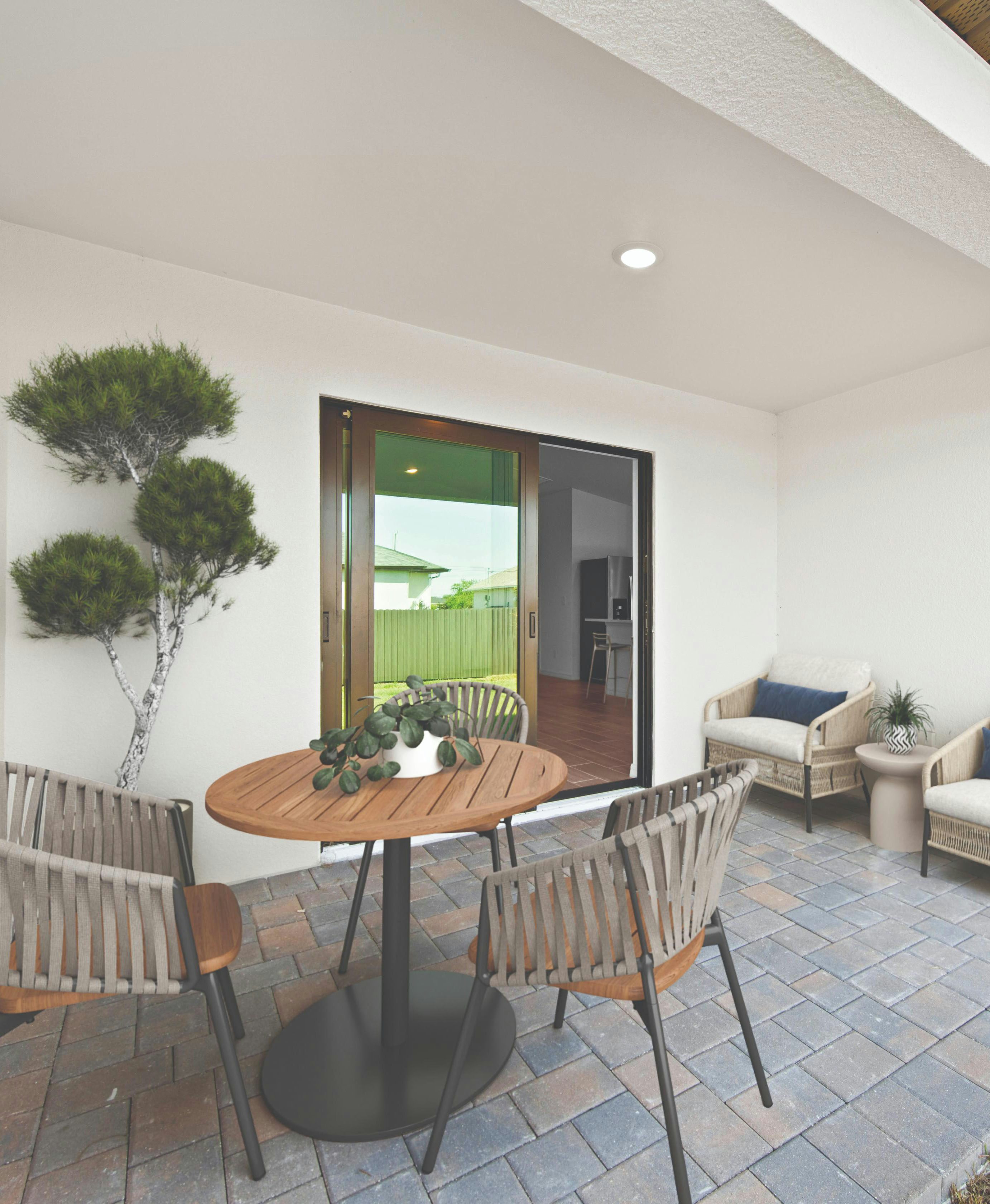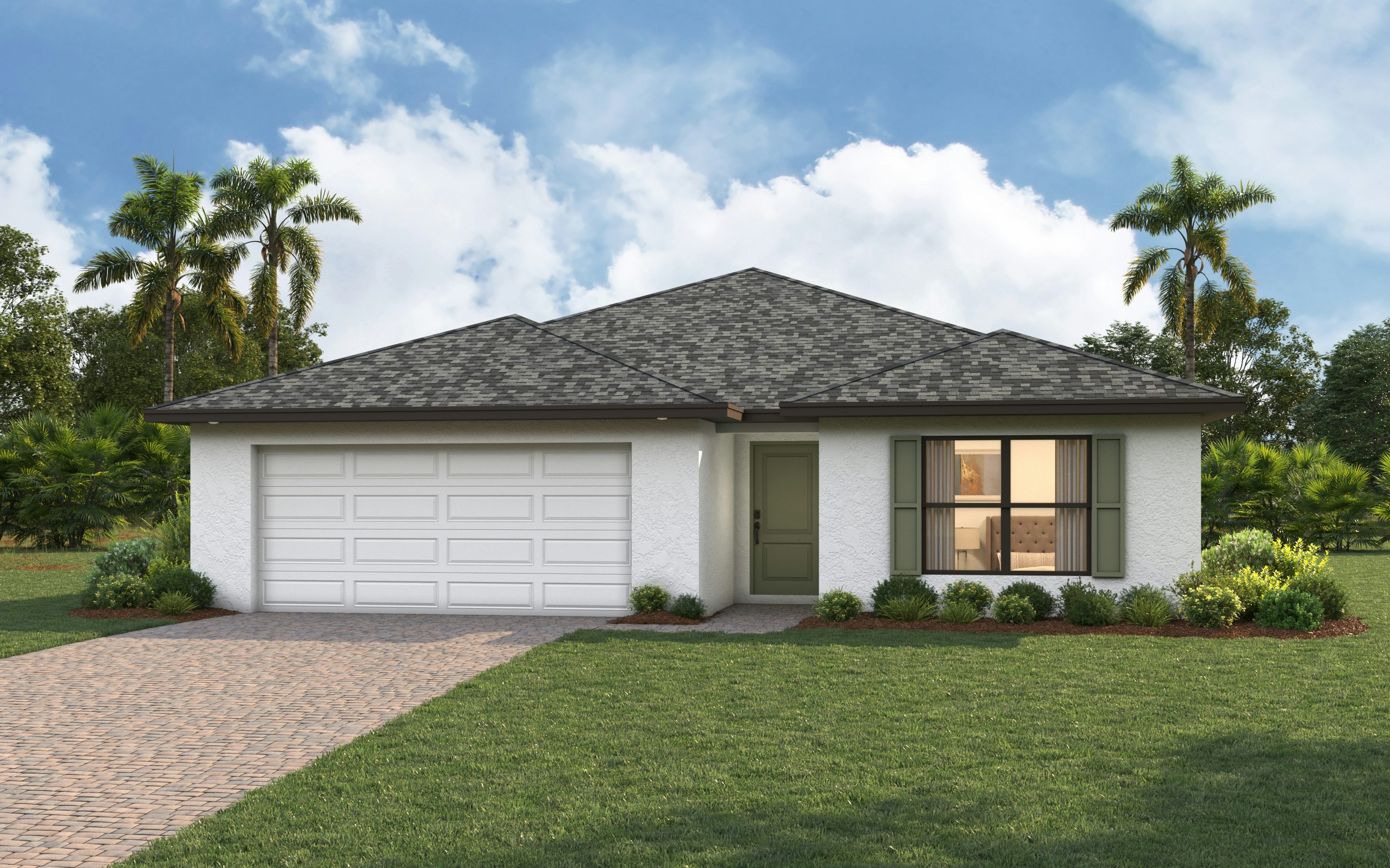 The Palm offers 1,550 square feet of thoughtfully designed living space. The spacious Great Room with its vaulted ceiling flows effortlessly to the private covered lanai—ideal for indoor-outdoor living and entertaining. At the heart of this open layout, the kitchen features a freestanding island, walk-in pantry, and designer cabinetry, opening to a bright dining area with a tray ceiling and abundant natural light. The primary suite includes a generous walk-in closet and a private bath with dual vanities, a tiled shower, and convenient linen storage. Additional highlights include upgraded plank tile throughout the main living areas, designer cabinetry & quartz counters in the kitchen and baths, hurricane-impact windows and doors, stainless steel kitchen appliances, and an attached two-car garage.