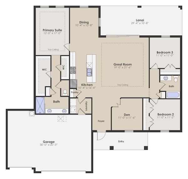 The Grand Cayman offers the perfect blend of style, functionality, and comfort, with 1,974 square feet of thoughtfully designed living space. At the heart of the home lies an open-concept layout ideal for entertaining, featuring a gourmet kitchen with a spacious island, a dedicated dining area, and an expansive Great Room with elegant tray ceiling. Triple sliding glass doors open to the large covered lanai, seamlessly blending indoor and outdoor living.  The luxurious primary suite is tucked away for privacy and showcases a tray ceiling, two large walk-in closets, and a spa-inspired en-suite bathroom complete with a dual-sink vanity, a beautifully tiled walk-in shower, and a private water closet.  On the opposite side of the home, a private hallway leads to two generously sized guest bedrooms and a well-appointed full bath, offering both comfort and convenience for family or visitors.  A versatile den located just off the foyer provides the perfect space for a home office, study, or creative retreat.  Additional highlights include:  8-foot interior doors throughout; Quartz countertops in kitchen and bathrooms; designer cabinetry with soft-close doors, stainless steel kitchen appliance package, upgraded plank tile in all main living areas, hurricane-impact windows and doors, 2-car garage with direct access to laundry room, and paver driveway and covered front entry.  Optional 3-car garage upgrade available on select homesites.